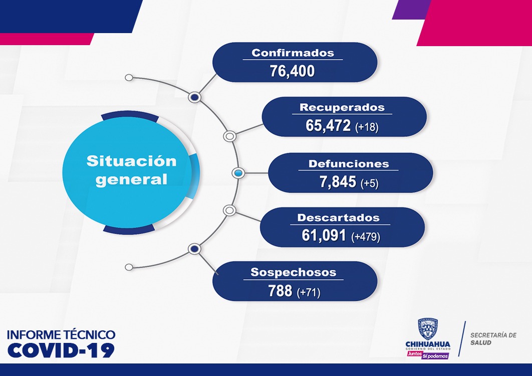 El reporte refleja 5 defunciones correspondientes al municipio de Juárez (2), Hidalgo del Parral (2) y Delicias (1), lo que suma un total de 7 mil 845 defunciones en lo que va de la pandemia en la entidad.