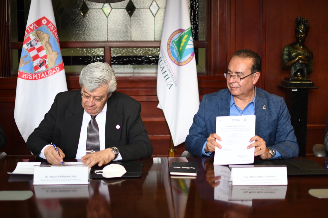 La firma de convenio, fue encabezada por el rector Jesús Villalobos Jión, Mario Mata Carrasco, titular de JCAS, así como Álan Jesús Falomir Sáenz director de JMAS y Sergio Rafael Facio Guzmán, secretario general de la UACH y el director de la Facultad de Ciencias Químicas Pedro Javier Martínez Ramos.