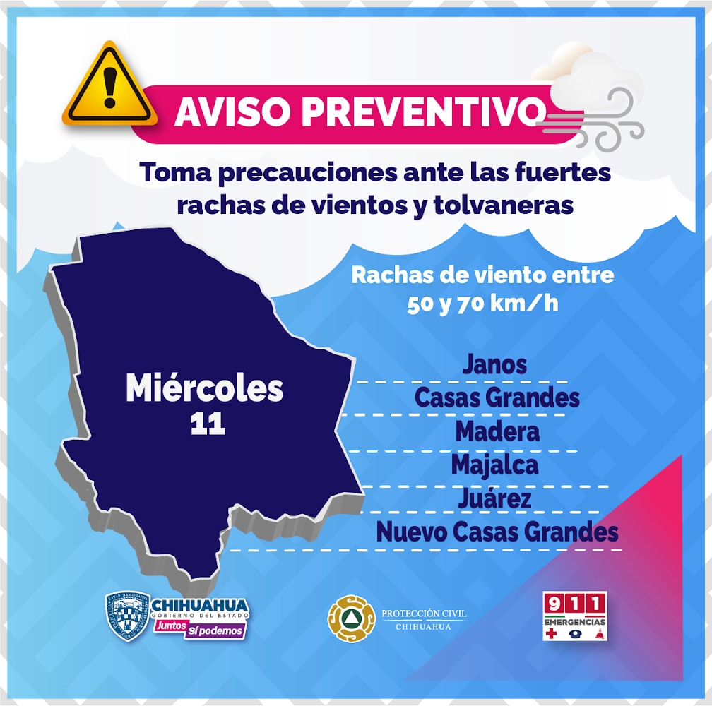 Para el miércoles 11 de enero, se espera que por la tarde se incremente considerablemente la velocidad del viento, con rachas que pueden oscilar entre 50 y 70 km/h en municipios de Janos, Casas Grandes, Madera, el norte de Chihuahua, Juárez y Nuevo Casas Grandes.