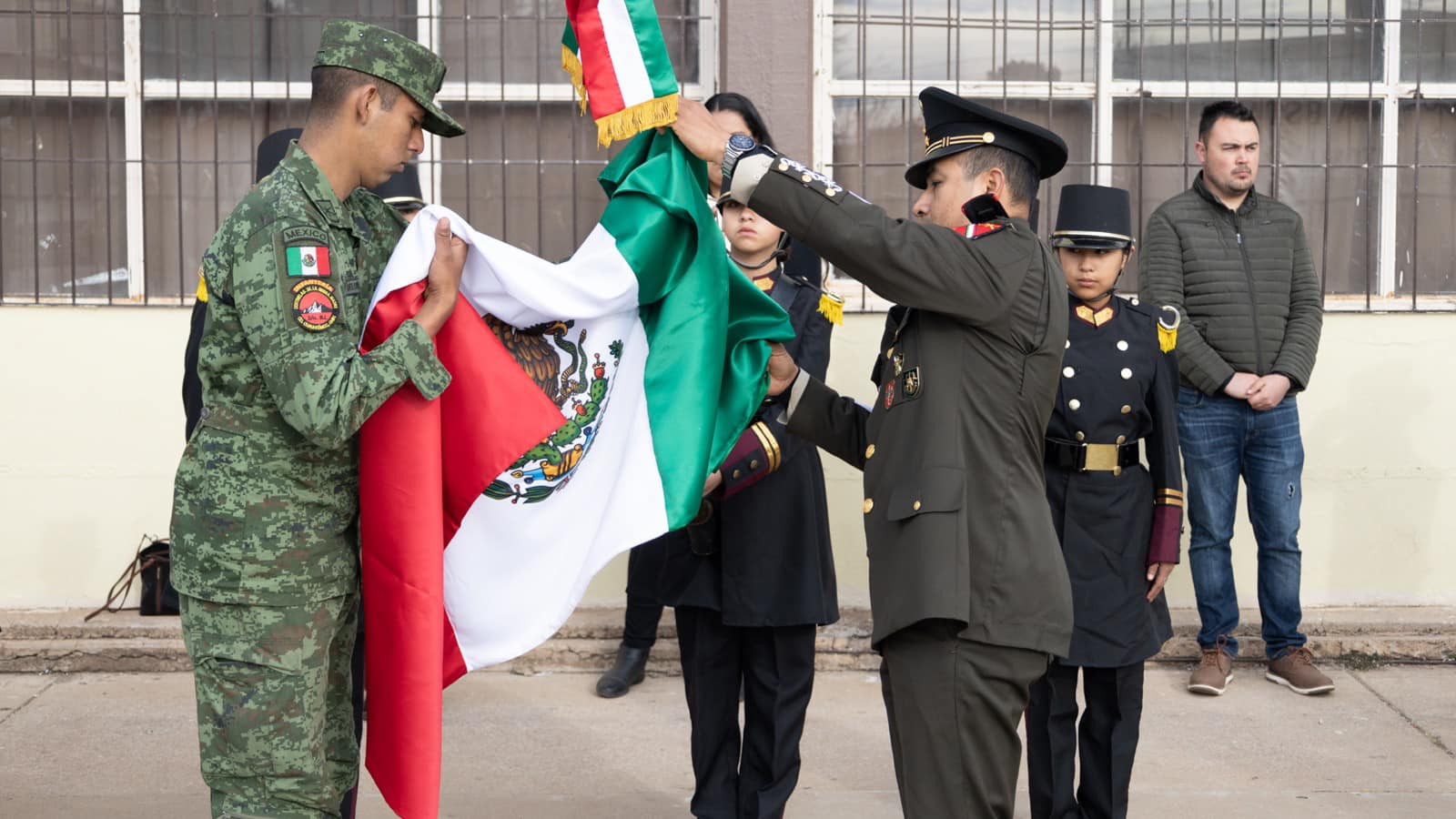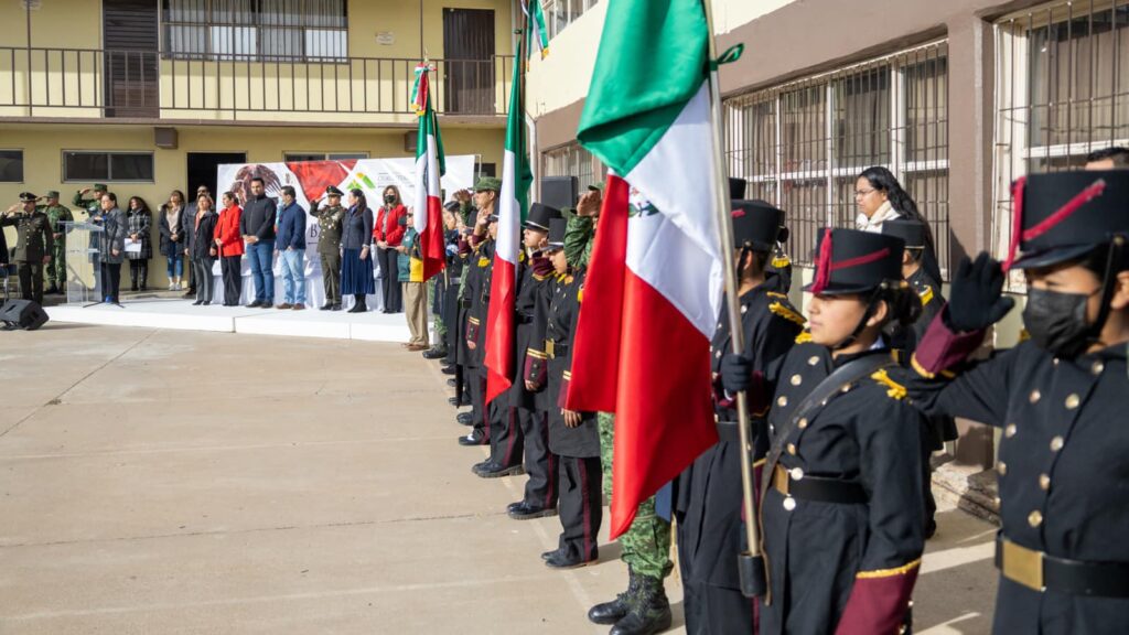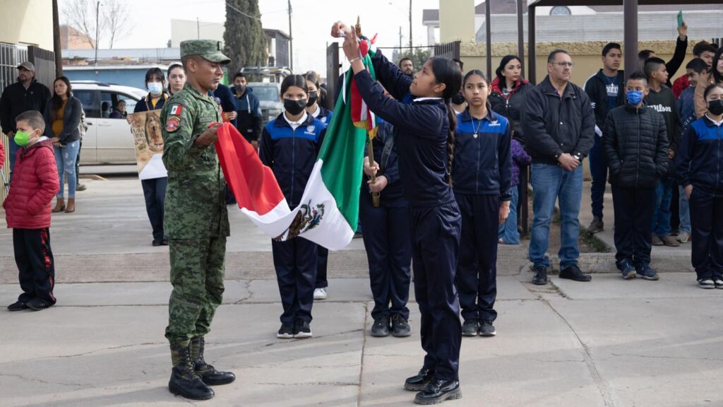 Cuauhtémoc, Chih.- En las instalaciones de la Escuela Secundaria Sertoma, se llevó a cabo la ceremonia con motivo de vigésimo tercer aniversario del Día de la Bandera, en la que participaron la Presidencia Municipal de Cuauhtémoc, a través de la Dirección de Desarrollo Social, y el Segundo Batallón de Infantería.