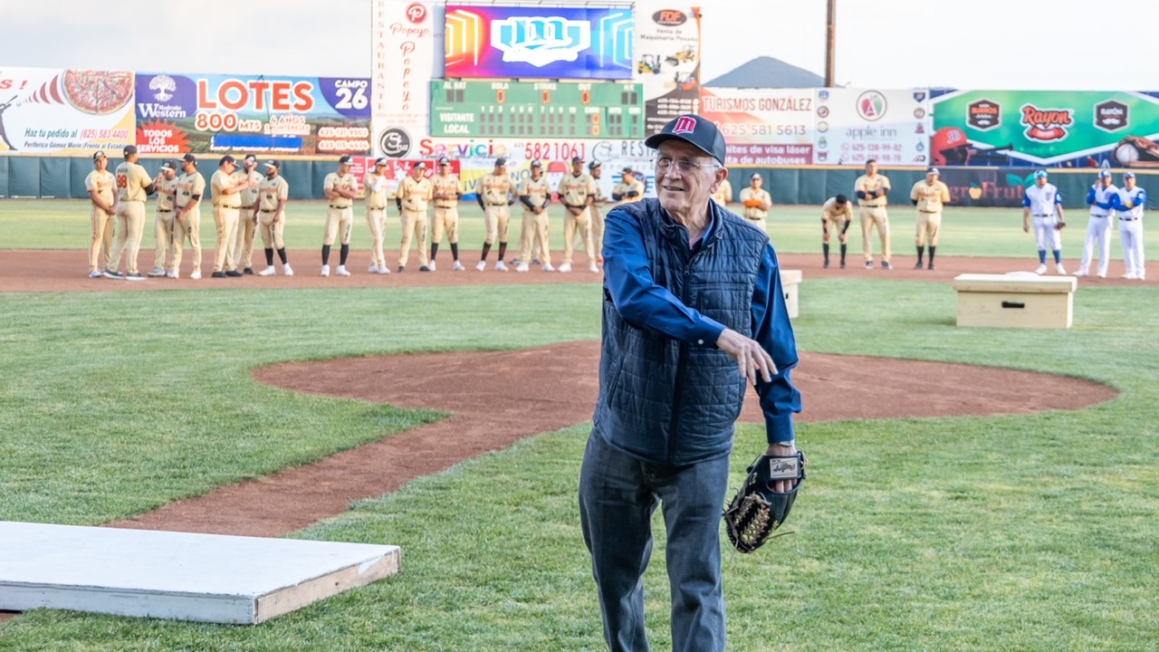 Durante su mensaje, el Presidente Municipal dio la bienvenida al equipo visitante, Algodoneros de Delicias, y a la afición que los acompañó.