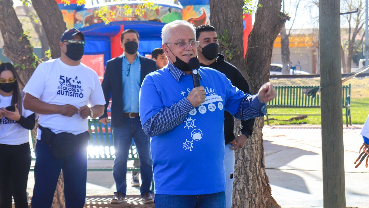Cuauhtémoc, Chih.- El alcalde Elías Humberto Pérez Mendoza acudió a la Quinta Carrera de Colores por el Autismo, donde destacó que lo más importante es la toma de conciencia sobre el autismo, para apostarle a la inclusión en nuestra sociedad.