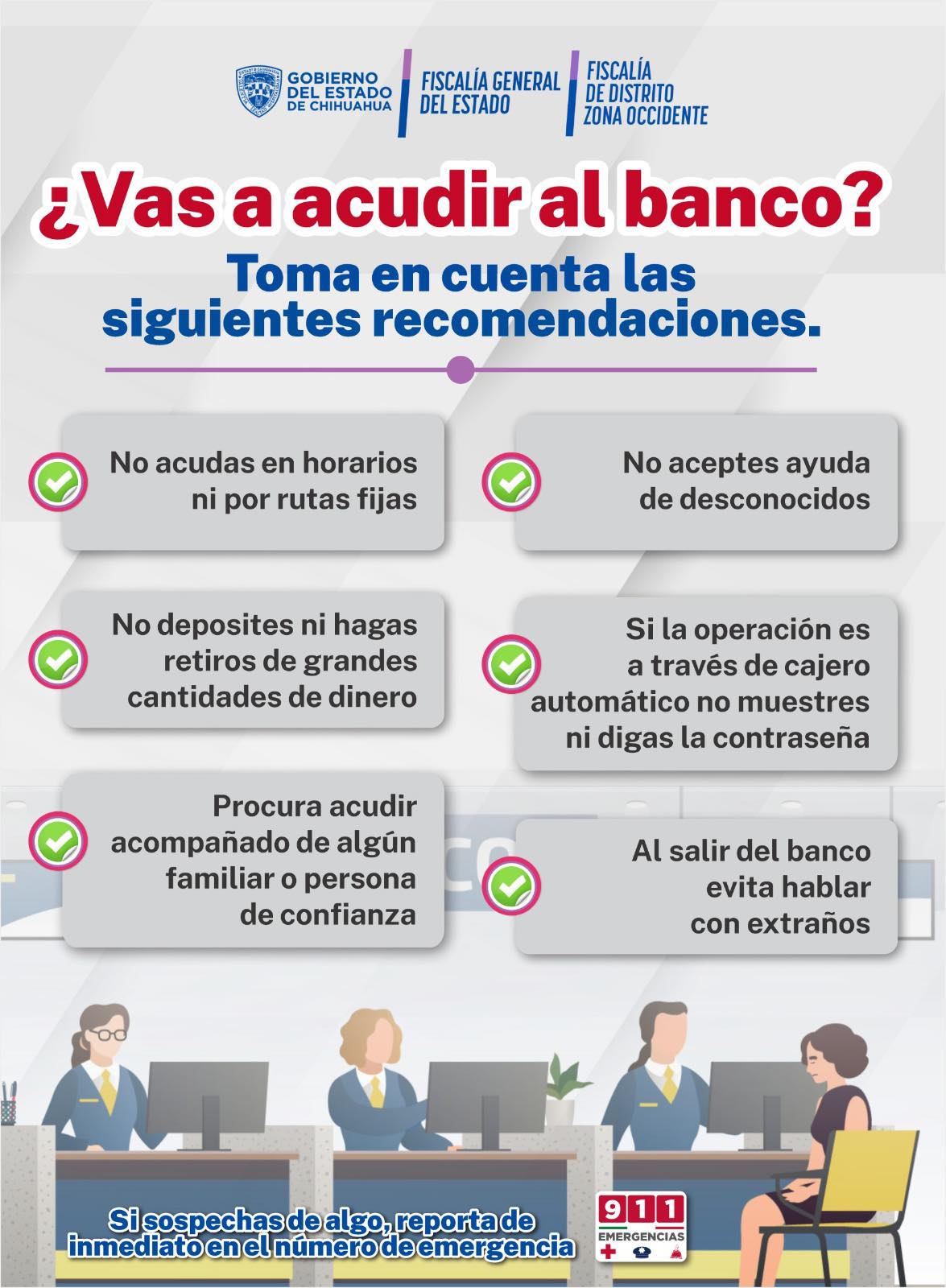 La Fiscalía de Distrito Zona Occidente, alerta a la población en general para evitar ser víctimas de robo al acudir a alguna institución bancaria a retirar dinero, ante casos recientes que se han registrado en que víctimas son despojados de cantidades importantes.