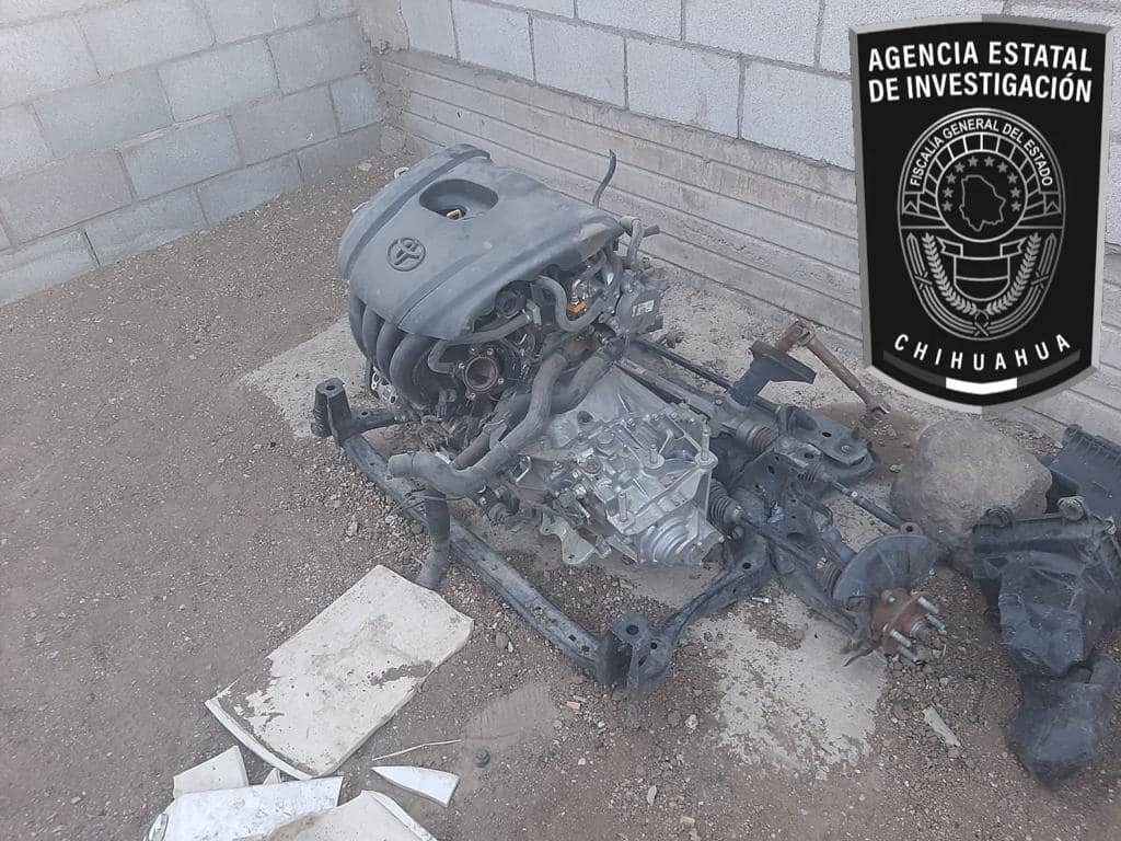 Durante el cateo, también se encontró un motor y una transmisión, un cofre, fenders, dos puertas y un volante, cuyas piezas corresponden a un vehículo de la marca Toyota, línea Yaris, el cual cuenta con reporte de robo del día 28 de septiembre del año 2021 en los Estados Unidos.