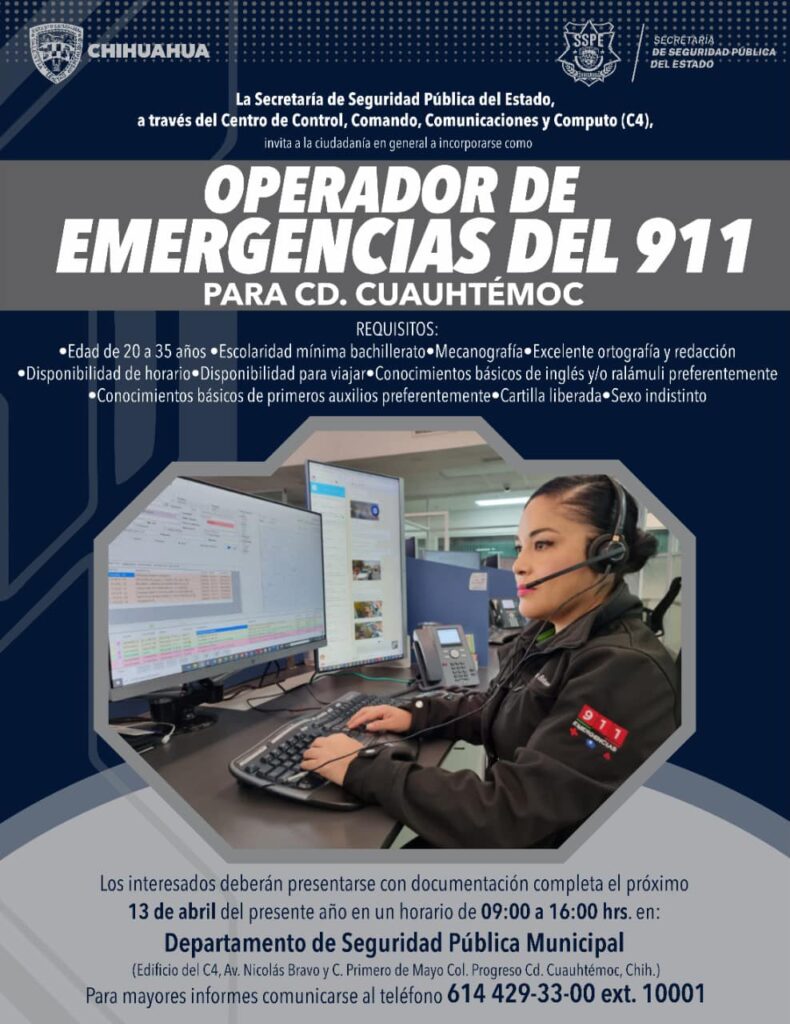 La Secretaría de Seguridad Pública del Estado (SSPE) a través del Centro de Control, Comando, Comunicaciones y Cómputo (C4) busca interesados en integrarse como Operador del 9-1-1 en ciudad Cuauhtémoc.