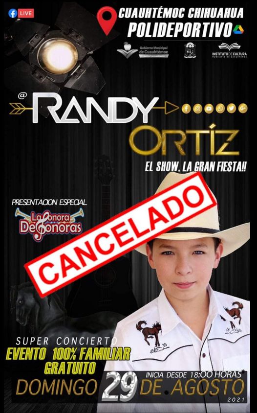 Derivado a un repunte de contagios por la pandemia del COVID-19 y con el interés de no poner en riesgo la salud de las personas, el Instituto de Cultura del Municipio de Cuauhtémoc determinó cancelar formalmente el concierto de Randy Ortíz.