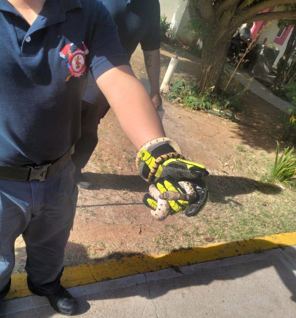 Son elementos del departamento de Bomberos de la base Cuauhtémoc quienes están certificados a través de la RedTox, para el manejo de serpientes, los cuales se hicieron cargo de capturar el ejemplar de Pituophis deppei, conocida también como Huajumar, la cuál es trasladada por los bomberos para su reubicación en su hábitat.