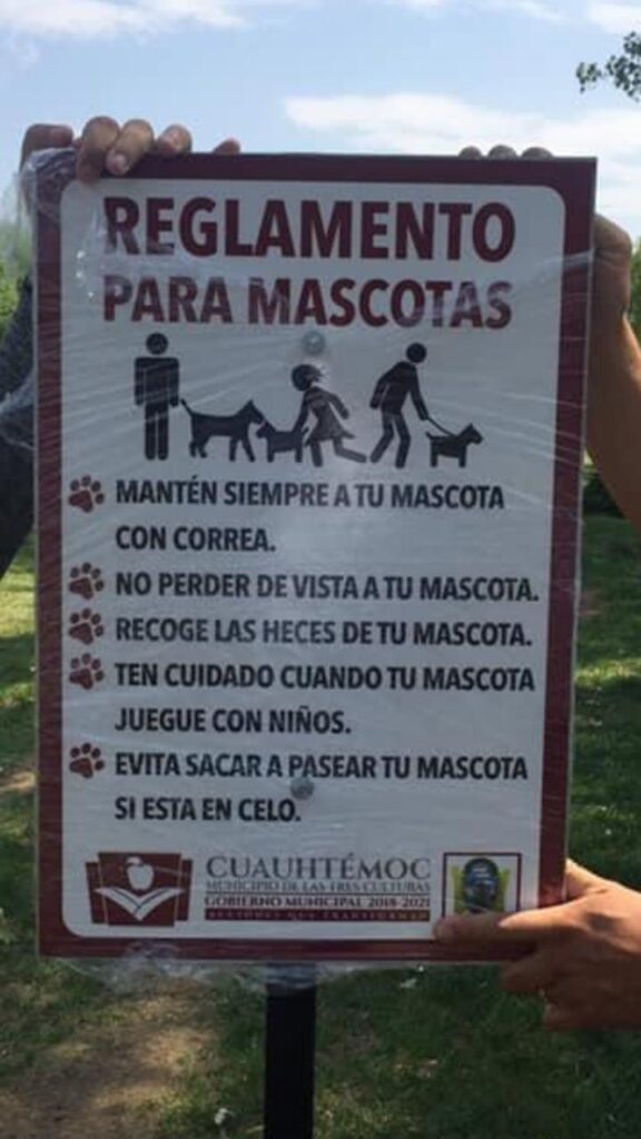 El Gobierno Municipal de Cuauhtémoc a través del Centro Municipal de Adopción y Contención Canina lleva a cabo la colocación de letreros con información dirigida a la población en general sobre cómo pasear correctamente a sus mascotas en la vía pública, principalmente en parques y áreas de uso común.