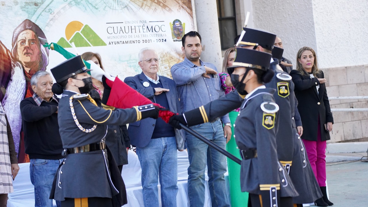 La banda de guerra y escolta del CBTa 90 dirigieron los Honores a la Bandera, mientras que elementos de la Dirección de Seguridad Pública Municipal se encargaron de izar el lábaro patrio en el asta bandera.