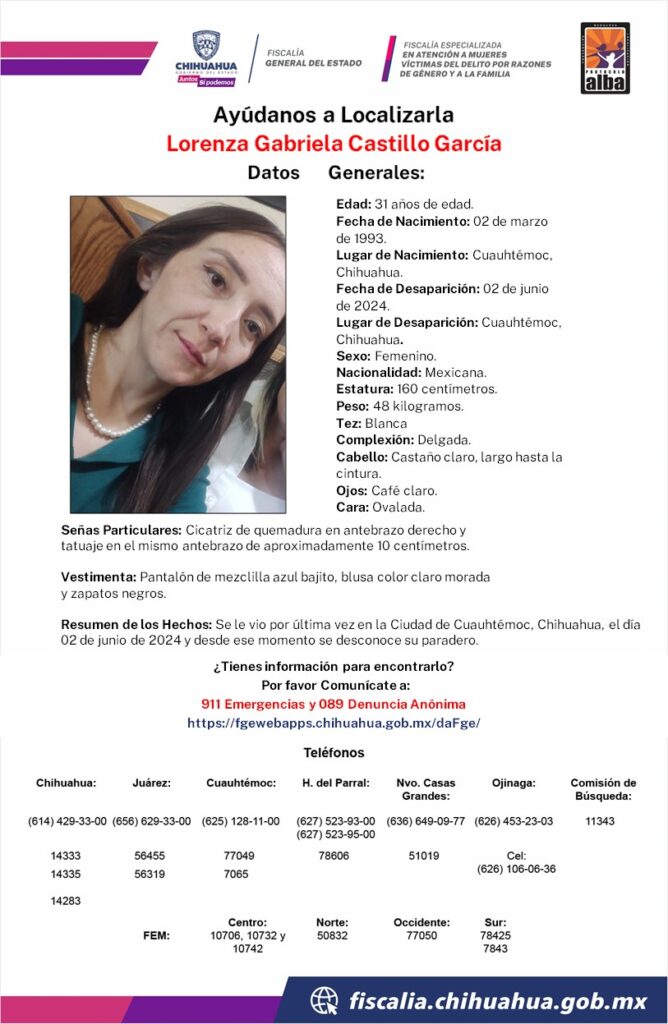 Cuauhtémoc, Chih.-En seguimiento a las acciones de búsqueda y localización de Lorenza Gabriela Castillo García, quien cuenta con reporte de ausencia desde el día 03 de junio del 2024, personal de la Fiscalía Especializada en Atención a Mujeres Víctimas del Delito por Razones de Género y a la Familia (FEM), en coordinación con la Agencia Estatal de Investigación y la Comisión Local de Búsqueda de la Fiscalía Especializada en Investigación de Violaciones a Derechos Humanos, realizaron un operativo en el municipio de Cuauhtémoc.