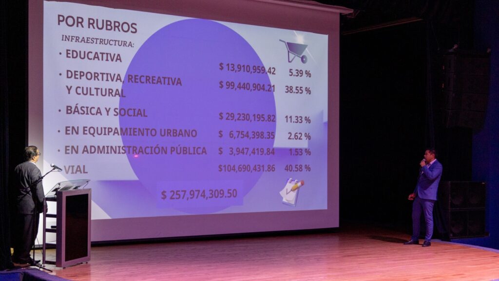Desglosado en rubros, el 9.74% será para infraestructura educativa; el 38.77% a infraestructura deportiva, recreativa y cultural; el 7.35% a infraestructura básica y social; el 3.77% a equipamiento urbano; el 1.08% a infraestructura en administración pública; y el 39.29% a infraestructura vial.
