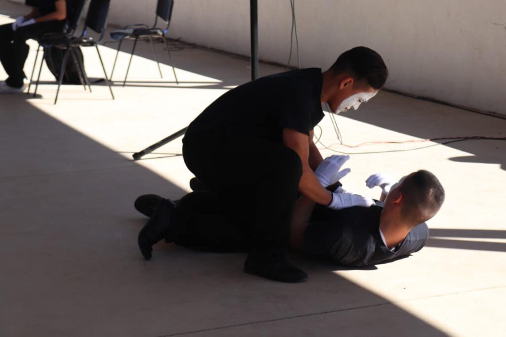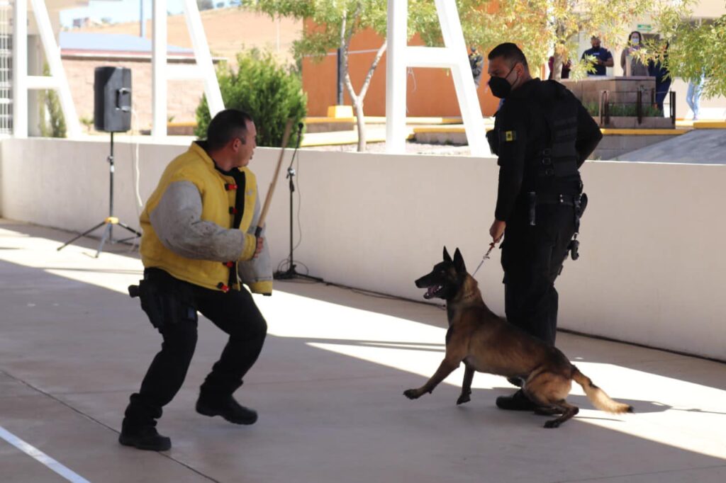 Finalmente, el grupo K-9, al mando del Sub-Oficial Juan Carlos Rentería, dio una exhibición de agentes y sus binomios, en los que se presenta a los estudiantes, la forma en que se trabaja con los canes por parte de la Dirección de Seguridad Pública Municipal.