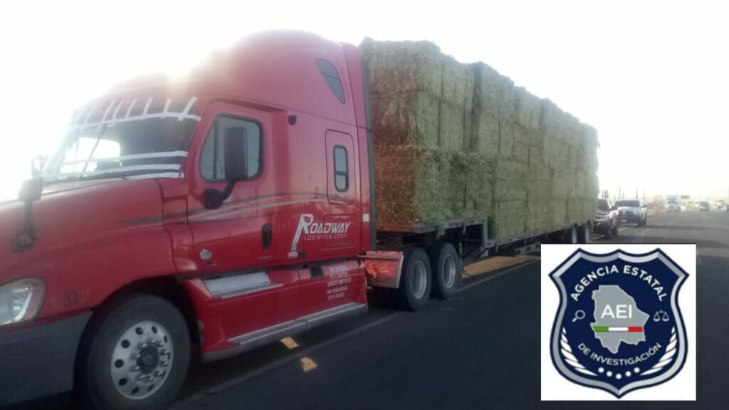 Cuauhtémoc, Chih.-Elementos de la Agencia Estatal de Investigación (AEI) detuvieron en flagrancia a dos choferes de tráiler por el robo de pacas de avena que se registró en un predio del campo menonita 110.