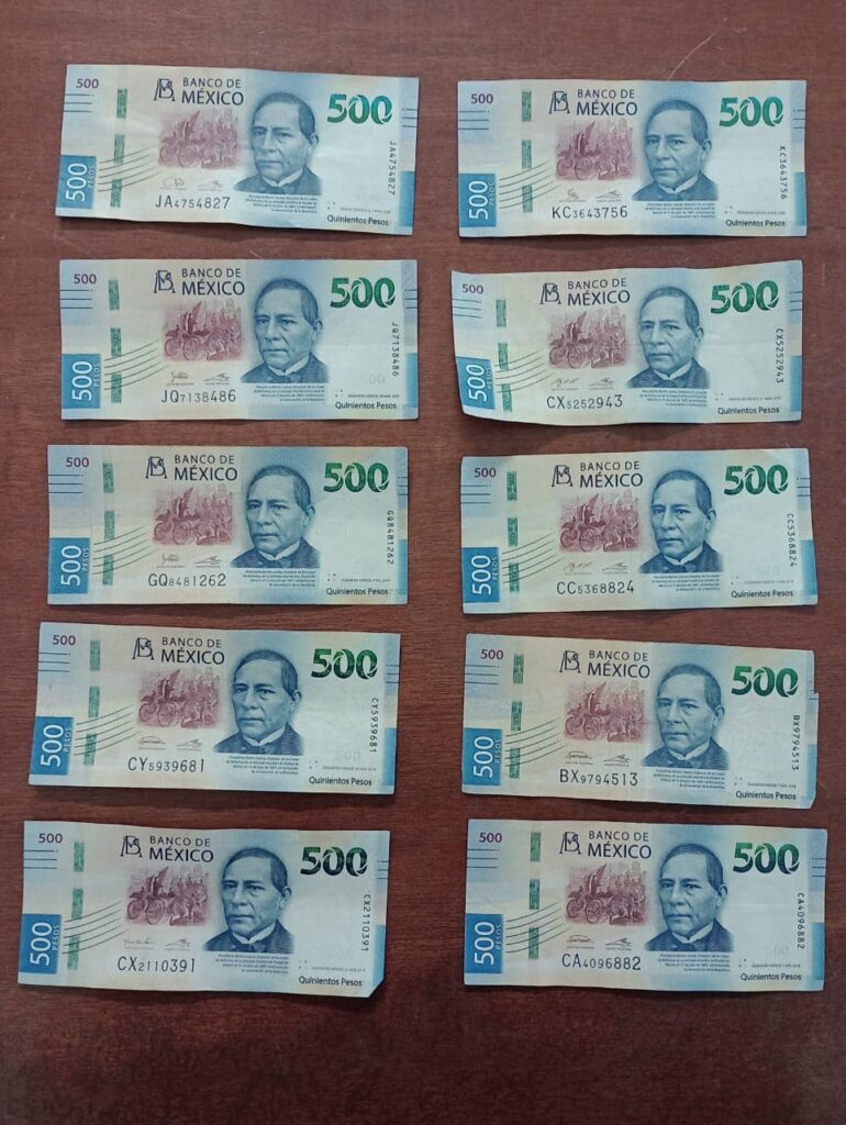 Al inspeccionar el cajero, el oficial encontró algunos billetes de denominación de 500 pesos, dando un total de 5 mil pesos. Fueron asegurados y se pusieron a disposición del Juez Calificador en la Prefectura local.