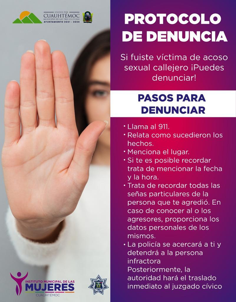 Cd. Cuauhtémoc, Chih.- El Instituto Municipal de las Mujeres y la Dirección de Seguridad Pública a través del área Justicia Cívica, lanzaron la campaña “El acoso callejero se castiga”, informando sobre sanciones que van desde la amonestación, hasta el arresto y pago de daños.