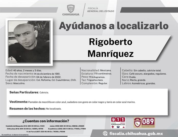 Cuauhtémoc, Chih.-La Fiscalía de la zona occidente emitió la pesquisa para tratar de dar con el paradero de Rigoberto Manríquez, de 40 años de edad, quien se encuentra desaparecido desde el pasado 04 de febrero, en esta ciudad de Cuauhtémoc.