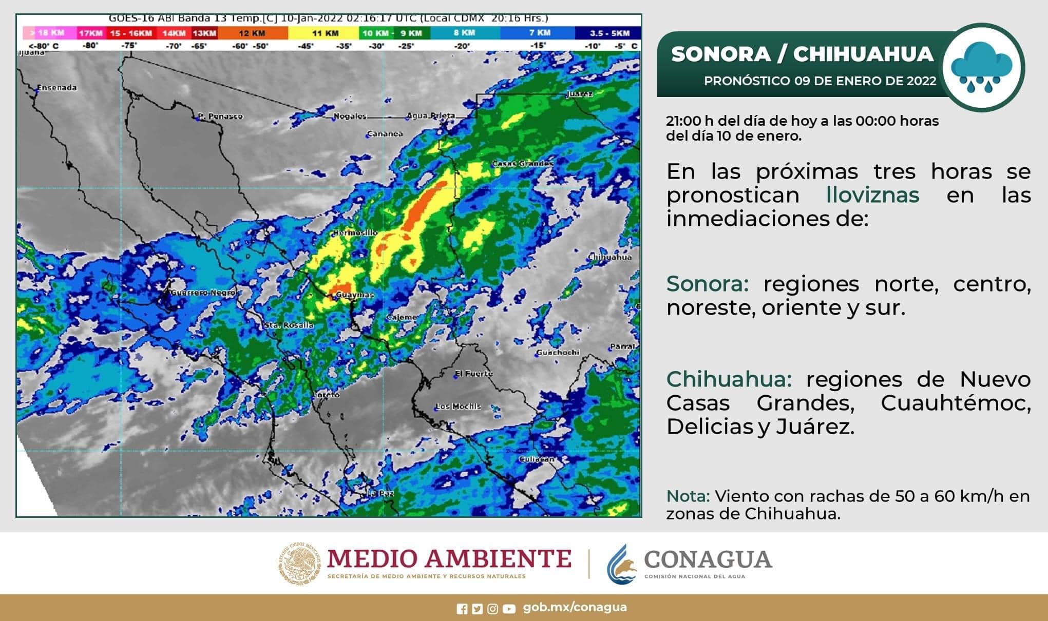 Rachas de viento con velocidad de 45 km/h pueden presentarse en Juárez, Ahumada, Janos y Camargo. Las lluvias se pueden presentar desde las primeras horas del lunes sobre los municipios de Janos Ascensión, Nuevo Casas Grandes, Madera, Ahumada, Juárez, Guadalupe y Buenaventura, con posible caída de nieve y aguanieve.