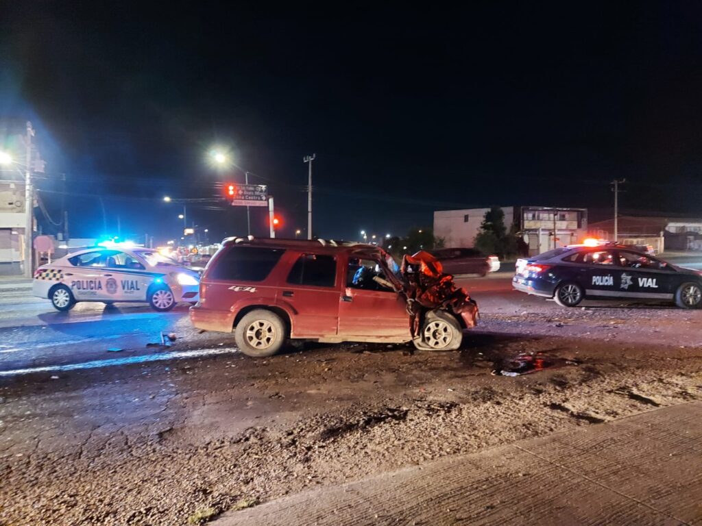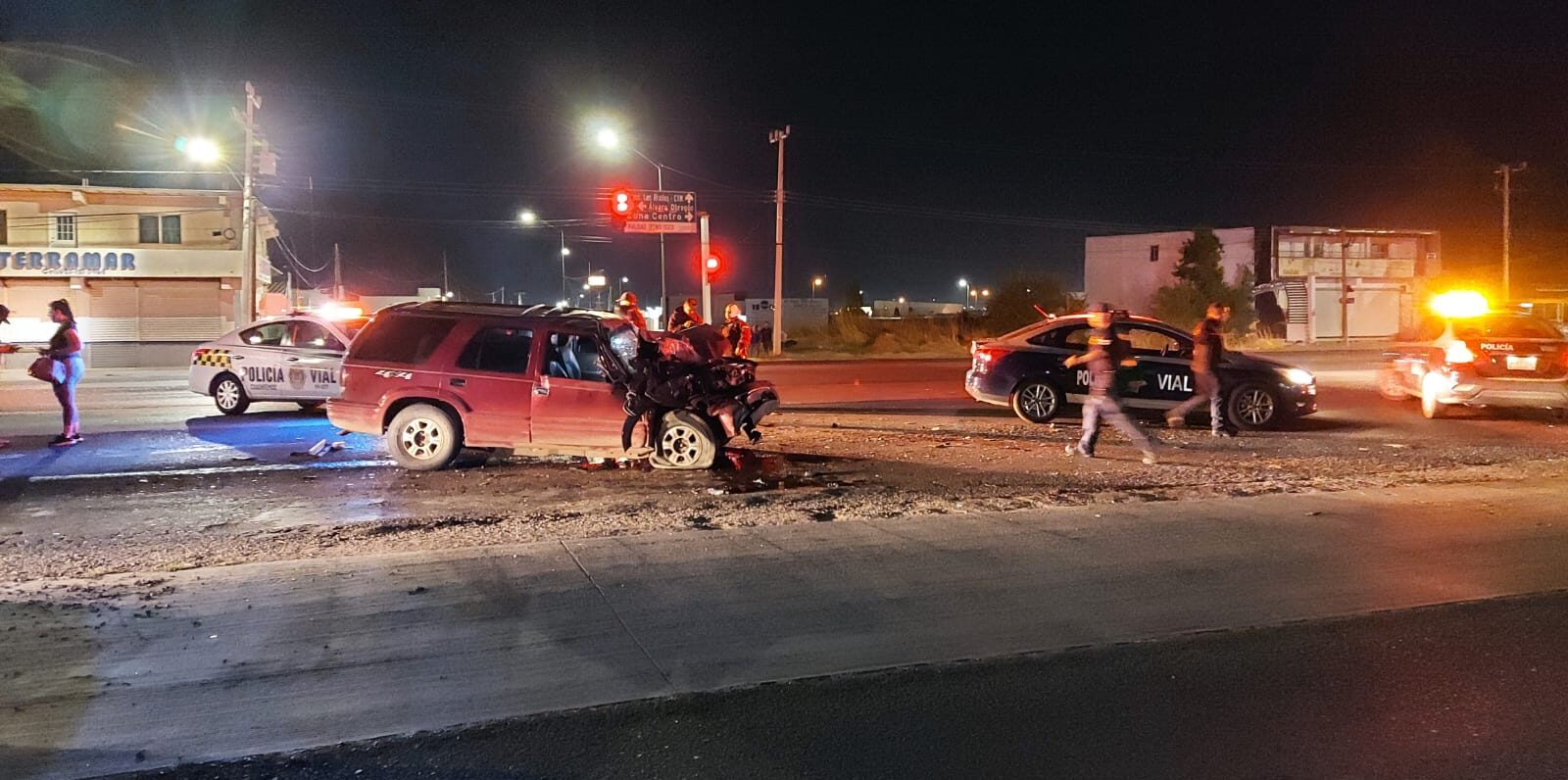 Cuauhtémoc, Chih.-Cuatro personas lesionadas, dos de ellas de consideración, así como cuantiosos daños materiales dejó un encontronazo registrado la noche de este domingo 08 de mayo, en la Vialidad Tecnológico y Avenida Colombia.