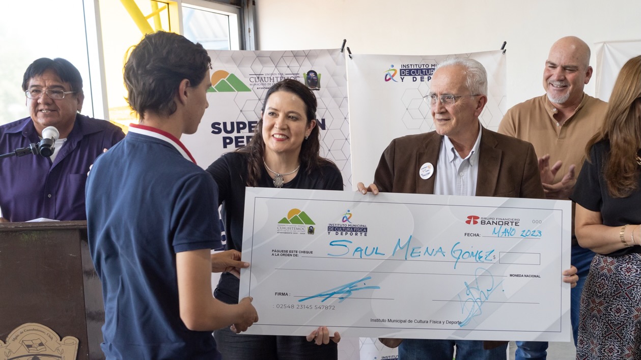 Durante el evento, en representación de los deportistas, recibió su beca de manera simbólica el marchista Saúl Mena Gómez, quien ha puesto el nombre de Cuauhtémoc muy en alto a nivel nacional e internacional.