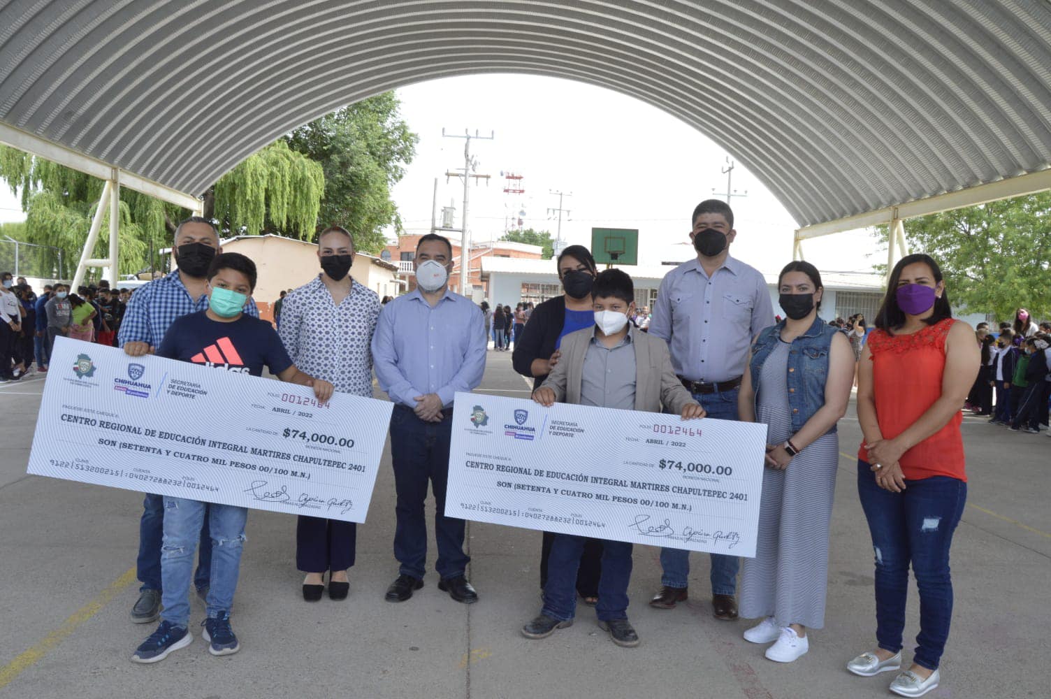 Estuvieron presentes de nueva cuenta en la escuela Mártires de Chapultepec, donde hicieron entrega del apoyo para la institución, por la participación en el programa de Diputado Infantil 2022 de Jonathan Corral Holguín y Santiago Gallegos Ornelas, alumnos de sexto grado.