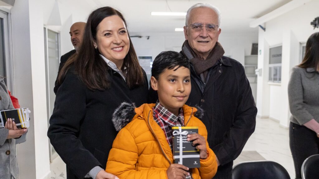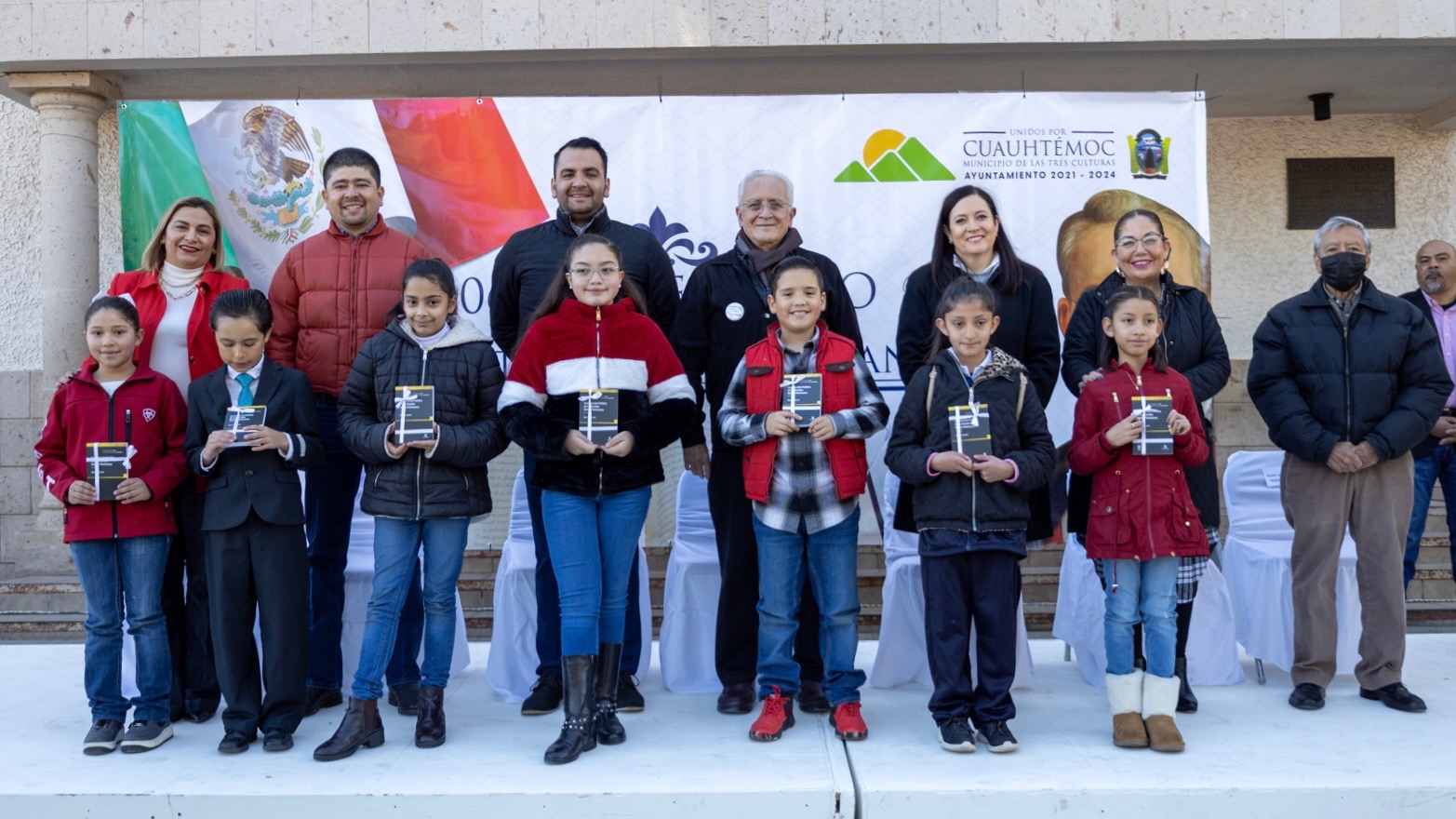 En representación, 7 alumnas y alumnos pasaron a recibir de manos del alcalde Elías Humberto Pérez Mendoza y del presídium libros de la Constitución.
