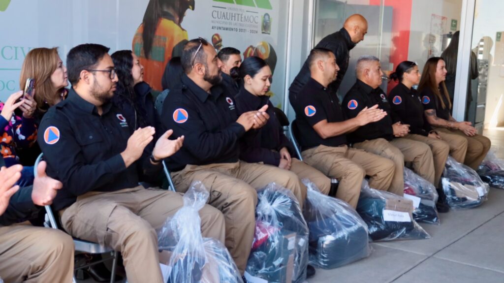Cd. Cuauhtémoc, Chih.- El alcalde Beto Pérez encabezó la entrega de paquetes de uniformes para los integrantes de la Coordinación Municipal de Protección Civil, en un evento donde reconoció el trabajo de cada uno de los elementos en favor de la sociedad cuauhtemense.