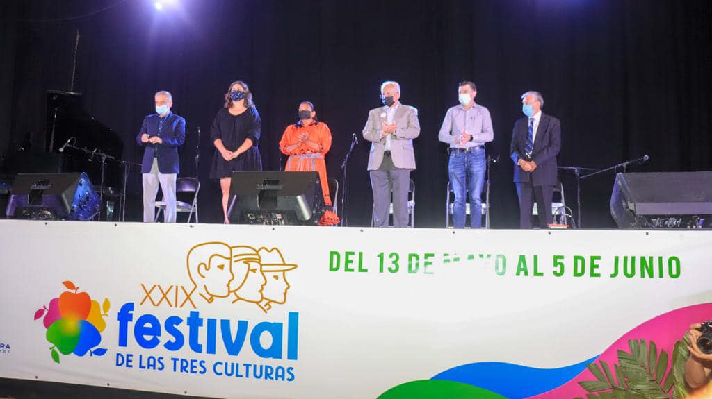 Cuauhtémoc, Chih.- El presidente municipal Beto Pérez declaró formalmente inaugurado el XXIX Festival de las Tres Culturas, en un evento en el Auditorio de las Tres Culturas, donde se realizó doble entrega de la Medalla al Mérito Cultural “Esteban López Solís”, y el tenor José Luis Ordóñez ofreció el concierto “Un Canto a mi Tierra”.