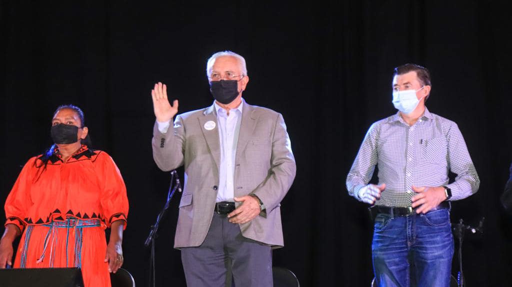 En el presídium estuvieron presentes la gobernadora indígena de la Colonia Tarahumara-Rayenari, Aurora Velazquillo Cruz; el presidente de la Colonia Manitoba, Guillermo Fehr; y el regidor presidente de la Comisión Acción Cívico-Social, Javier Cuevas Lira.