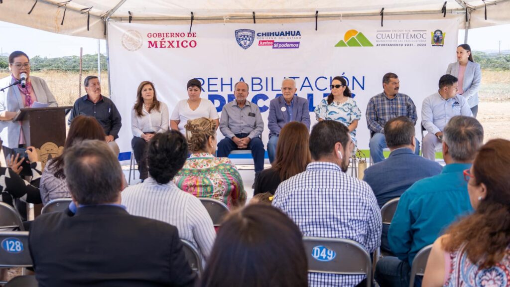 Cd. Cuauhtémoc, Chih.- El presidente municipal Beto Pérez y el director regional del Gobierno de México, Óscar Leos, encabezaron la inauguración de dos obras: pavimentación con concreto hidráulico en dos tramos del Fraccionamiento Vista Hermosa, y el recarpeteo de la Vialidad Venezuela, entre la calle Valle Hondo y avenida Tecnológico; con una inversión de más de 8.7 millones de pesos, procedentes del Registro Público Vehicular (Repuve).