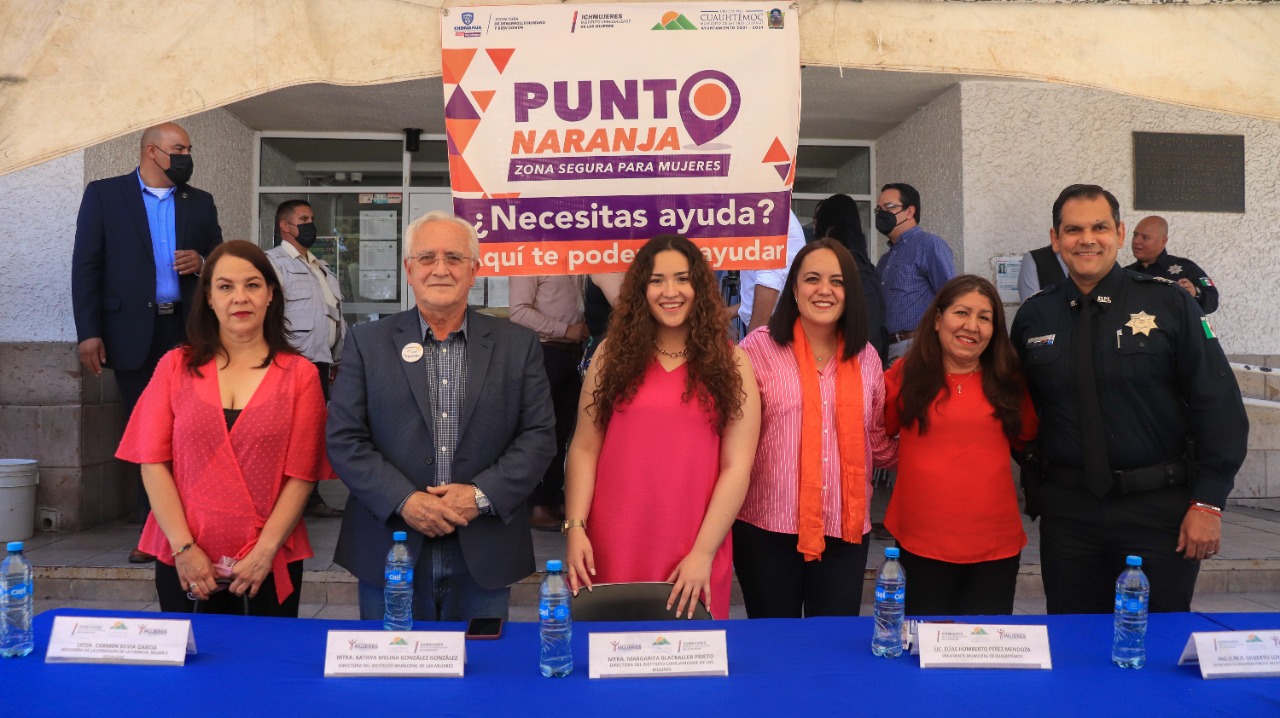 Los Puntos Naranja en Cuauhtémoc son: Presidencia Municipal, la Comandancia de la Dirección de Seguridad Pública Municipal, Vialidad, DIF Municipal y el IMMujeres.