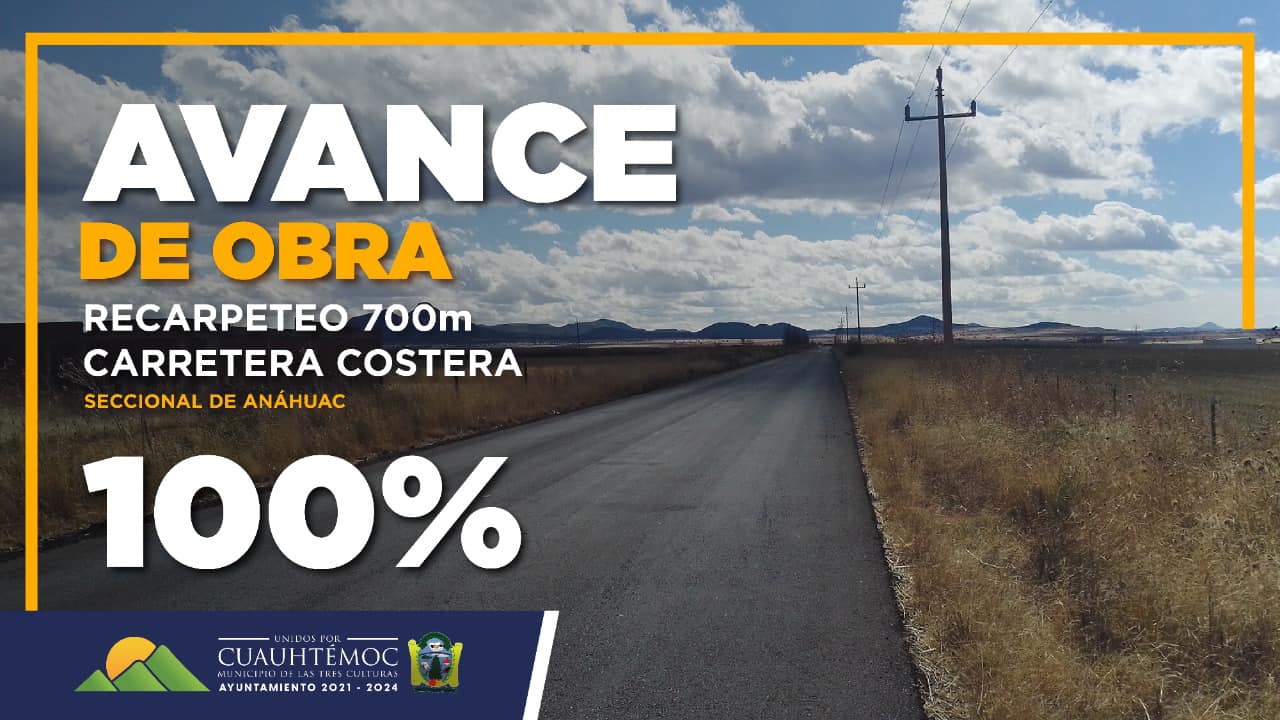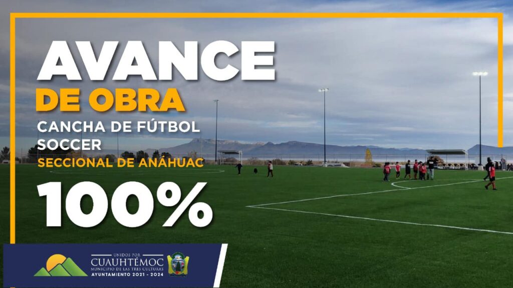 En el seccional de Anáhuac se finiquitó la avenida Ejido. En tramo entre las calles Tercera y Cuarta solo faltan pintura y banquetas. Se concluyeron también una cancha de futbol soccer, la pavimentación del entronque Camilo Daniel y una cancha de futbol 7 en la Secundaria Técnica 27.