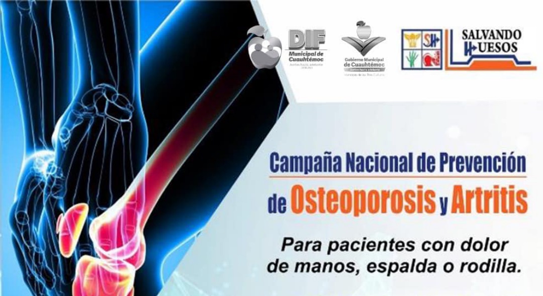 El Gobierno Municipal de Cuauhtémoc a través del Sistema DIF y en cordinación con la asociación civil Salvando Huesos, invita a la población en general a la campaña de prevención y diagnóstico de osteoporosis, artritis y osteoartritis, “Salvando Huesos”, la cuál se llevará a cabo del 16 al 27 de agosto.