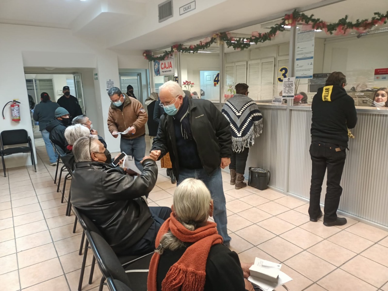 El Presidente Municipal, acompañado de la directora de Finanzas, Patricia Ramírez, recorrió la zona de cajas de la Tesorería, y el Auditorio de las Tres Culturas, donde esperan los ciudadanos su turno, a fin de resguardarlos del frío.
