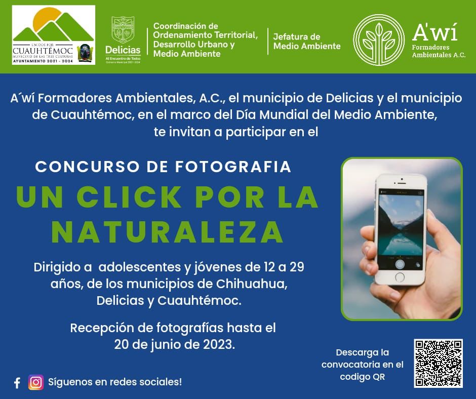 Cd. Cuauhtémoc, Chih.- A’wí Formadores Ambientales, A. C., y el Departamento de Ecología del Municipio, invitan a personas de 12 a 29 años a participar en el concurso de fotografía “Un click por la naturaleza”.