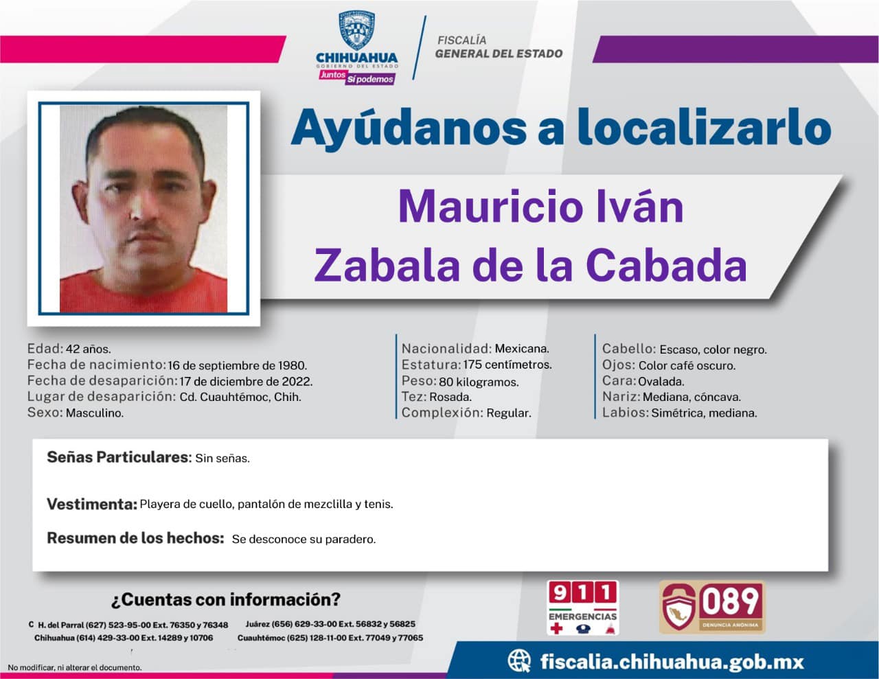 La mañana del sábado 17 de diciembre, sus familiares acudieron a solicitar auxilio para dar con el paradero El que pde esta persona de 42 años de edad, cuyo vehículo de alquiler que conduce fue encontrado abandonado esa misma mañana en las calles Río Ejido y Río Bravo del Barrio Santa María en la ciudad de Cuauhtémoc.