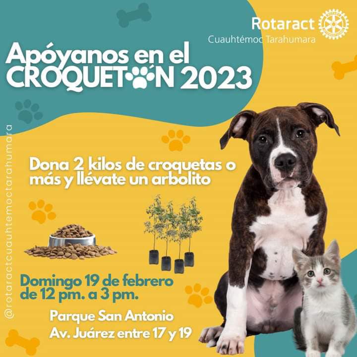 Cuauhtémoc, Chih.- Rotaract Cuauhtémoc Tarahumara invita a la ciudadanía en general a sumarse al Croquetón 2023, donde lo recaudado será destinado a alimentar a perritos callejeros.