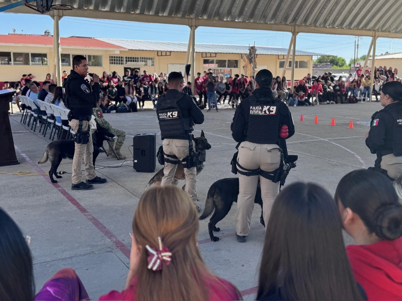 Posteriormente, los estudiantes presenciaron una demostración por parte del grupo K9 de la Policía Estatal, donde los caninos especializados mostraron sus habilidades en detección y seguridad. Más adelante, personal de la SSPE impartió talleres enfocados en la prevención de delitos cibernéticos y la violencia, como parte del programa de acompañamiento escolar.