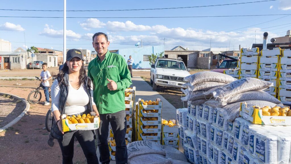 Cd. Cuauhtémoc, Chih.- La colonia Manitoba donó una tonelada de frijol y una tonelada de harina de maíz, y la empresa de manzana Indian Joy donó 210 cajas de mango, que fueron distribuidas entre familias de escasos recursos, de las colonias Los Alcaldes y Moisés Caraveo.
