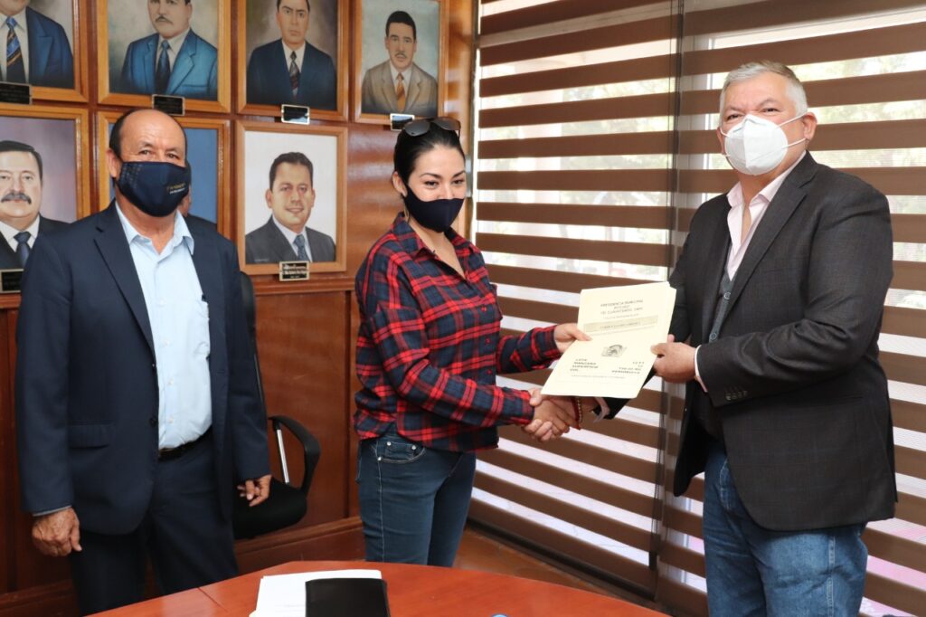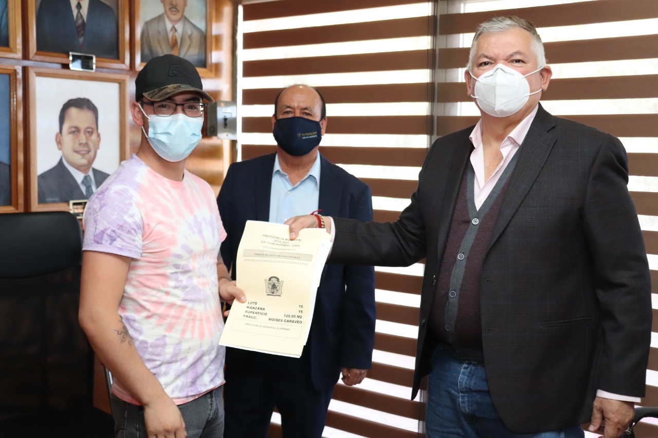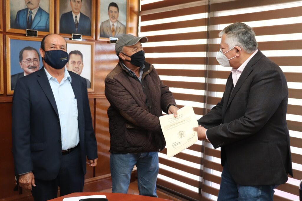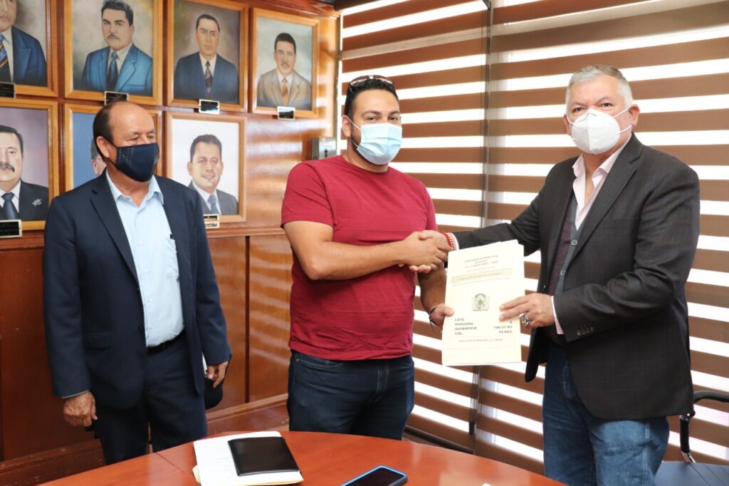 En un evento protocolario que por cuestiones de la pandemia únicamente asistieron ocho de los beneficiarios, el Presidente Municipal, Romeo Antonio Morales Esponda, acompañado del director de Desarrollo Urbano, Humberto Mendoza Domínguez, otorgó los documentos formales que legalizan la propiedad de algún terreno o vivienda de los implicados.