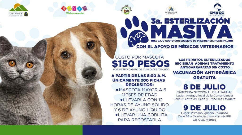Cd. Cuauhtémoc, Chih.- La tercera Campaña de Esterilización Masiva a bajo costo, con subsidio del Gobierno Municipal de Cuauhtémoc, a través de la Dirección de Servicios Públicos, se llevará a cabo el 8 de julio en Anáhuac, y el 9 de julio en Cuauhtémoc.