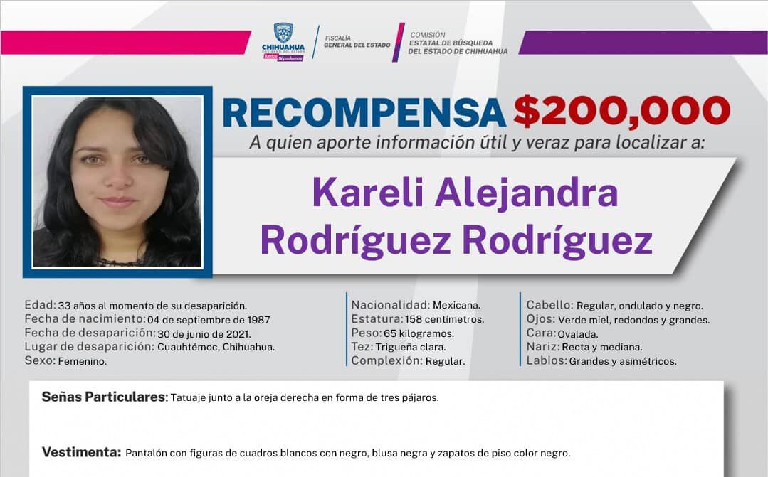 Cuauhtémoc, Chih.-La Fiscalía General del Estado ofrece Recompensa de 200 mil pesos, a quien aporte información para dar con el paradero de Kareli Alejandra Rodríguez Rodríguez, de 33 años de edad.