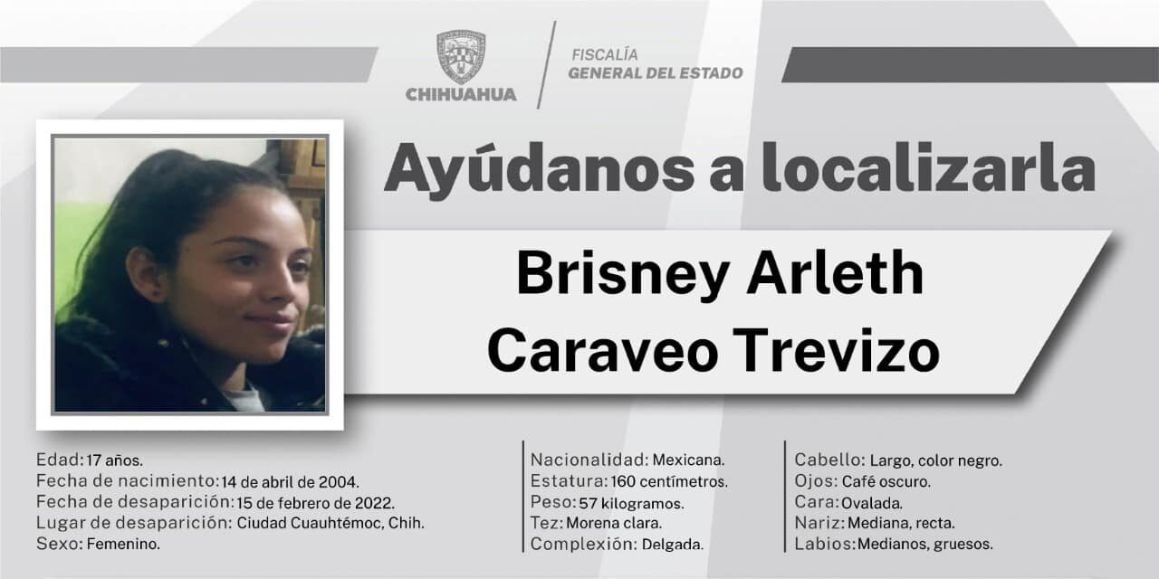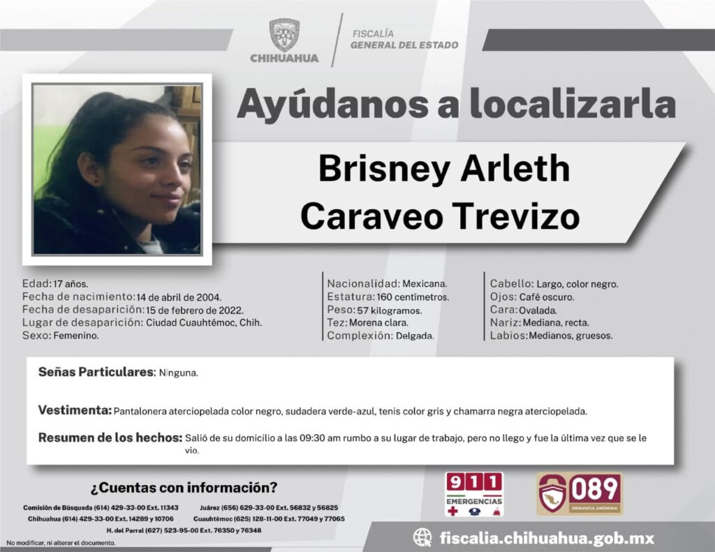Cuauhtémoc, Chih.-Se pide la colaboración de la población en general para tratar de dar con el paradero de Brisney Arleth Caraveo Trevizo, de 17 años de edad, quien salió de su domicilio en en esta ciudad de Cuauhtémoc, para dirigirse a su trabajo. Desde el pasado 15 de febrero no se sabe nada sobre su paradero.