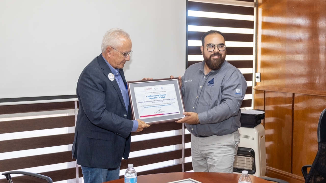 La entrega del certificado la realizó el director de la Región Sanitaria Cuauhtémoc, Francisco Alexis Hernández, al presidente municipal Beto Pérez. A la par, le entregó un reconocimiento por la Certificación como Entorno Laboral Saludable otorgado por la Secretaría de Salud del Estado de Chihuahua, correspondiente al edificio principal de la Presidencia Municipal y al edificio “Fernando Suárez Coello”. La placa oficial llegará en los próximos días.