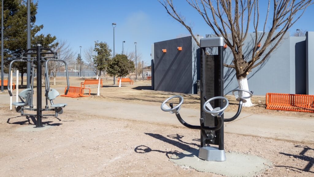 A un costado, presenta avance la colocación de gradas, la construcción de vestidores y baños; y en resto del lugar se observa el graderío puesto en las canchas de volibol y basquetbol, la instalación de mobiliario urbano para hacer ejercicio y bancas, la colocación de pintura en resbaladeros y barandales, y la instalación de una palapa en el área de asadores, entre otras acciones.