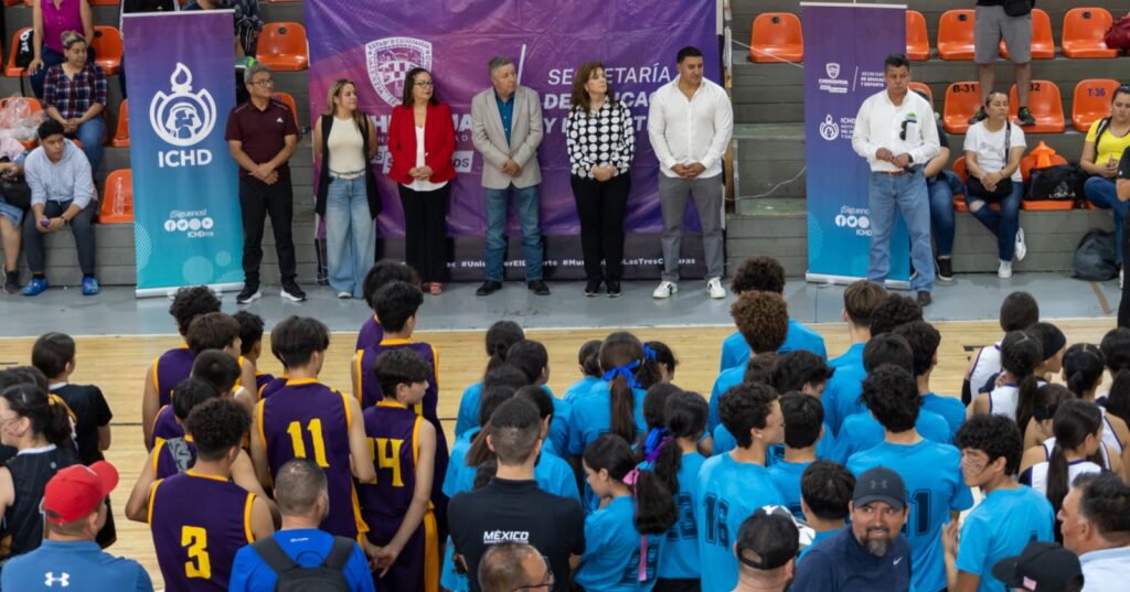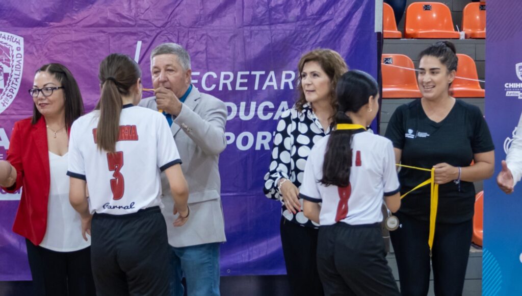 Cd. Cuauhtémoc, Chih.- La subdirectora del Instituto Chihuahuense del Deporte y Cultura Física, Cecilia Dozal, y el presidente municipal Ignacio Malaxechevarría, encabezaron la premiación del torneo “Juntos en el Deporte Escolar”, donde Cuauhtémoc fue sede de las disciplinas de basquetbol y cachibol matemático.