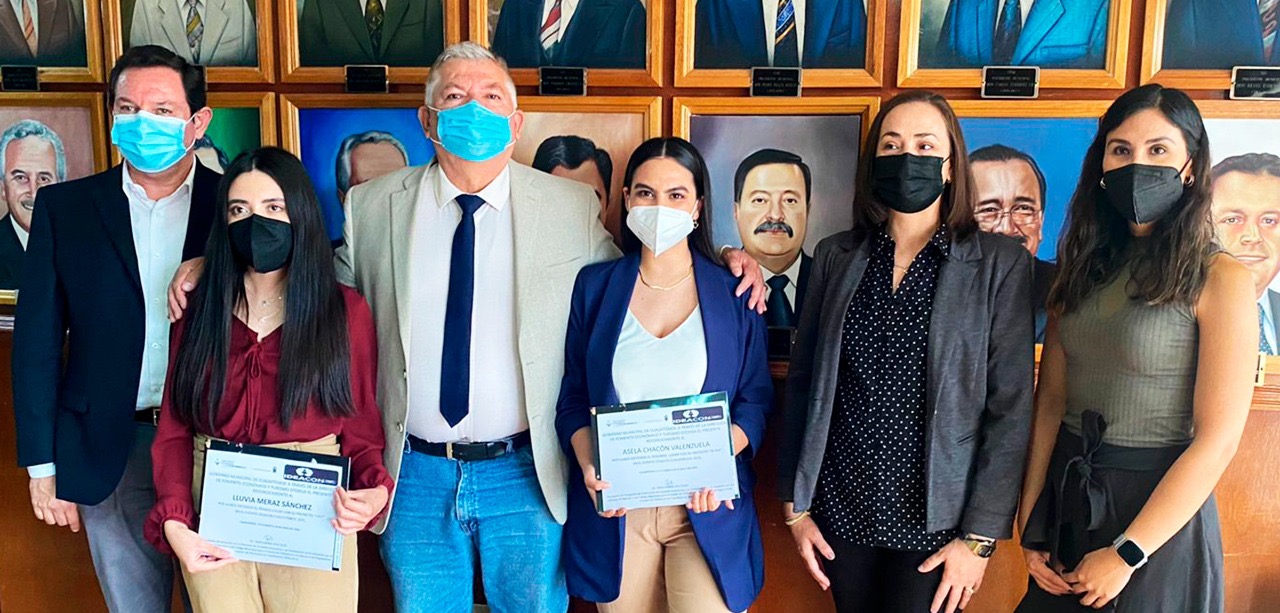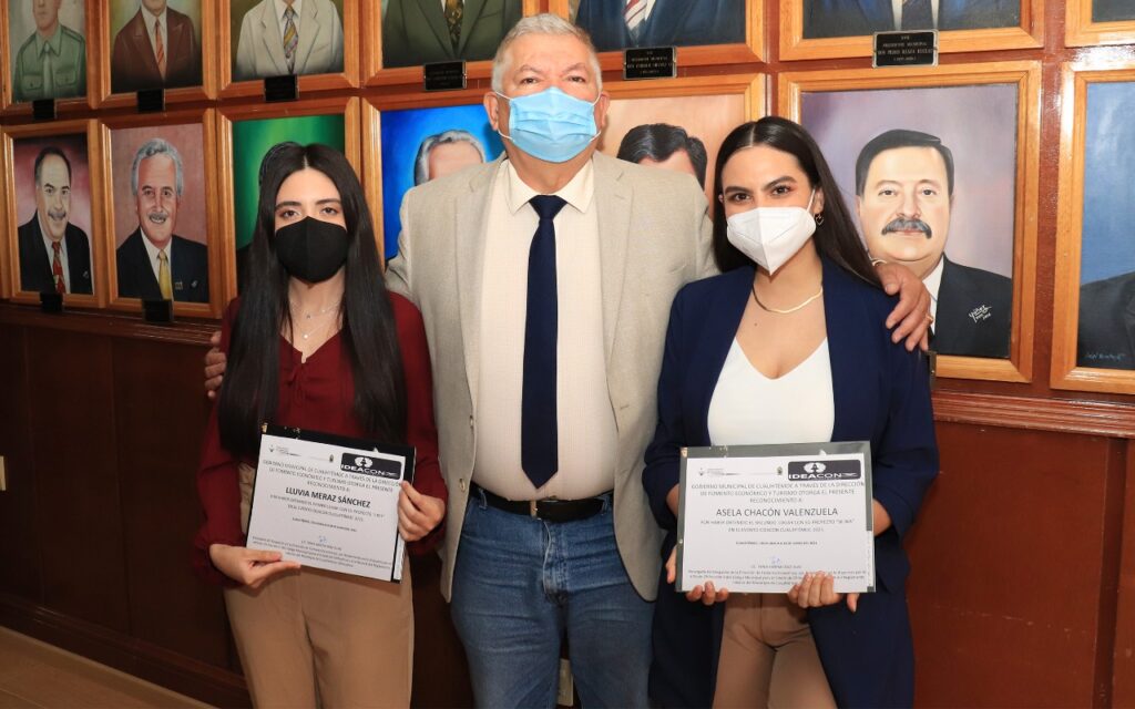 El Presidente Municipal, Romeo Antonio Morales Esponda, acompañado de la encargada de la Dirección de Fomento Económico, Tania Karina Díaz Islas y el coordinador de vinculación del Parque de Innovación La Salle, Jaime Luciano Fernández Chávez, entregó los premios a Asela Chacón Valenzuela y a Lluvia Sánchez Meráz, ganadoras del segundo y primer lugar.