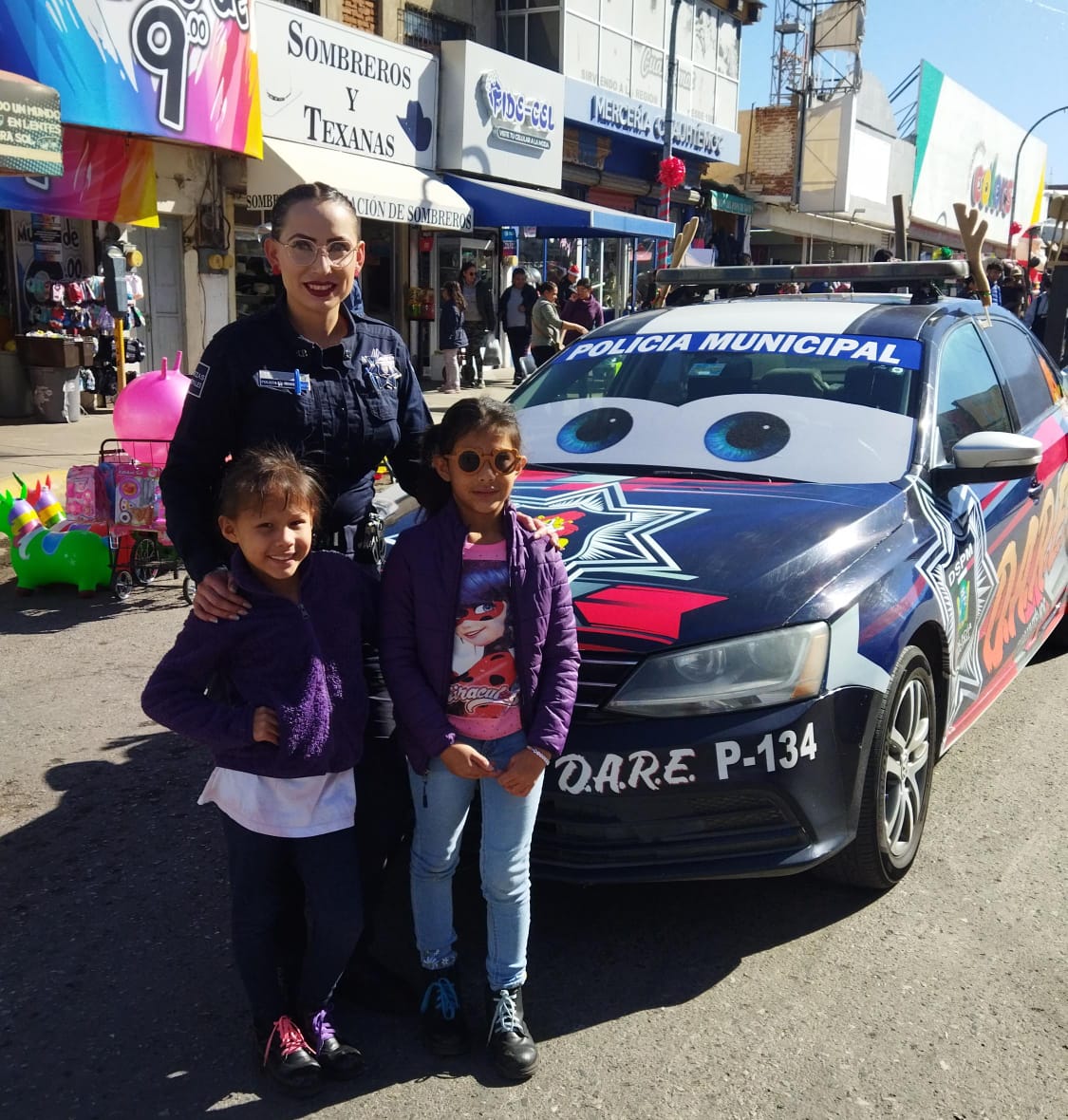 Cuauhtémoc, Chih.-La Dirección de Seguridad Pública Municipal estuvo presente en el Sendero Navideño con la participación de los agentes del grupo D.A.R.E., quienes convivieron con los más pequeños, hablando sobre prevención y realizando labores de proximidad social con los comerciantes de este sector.