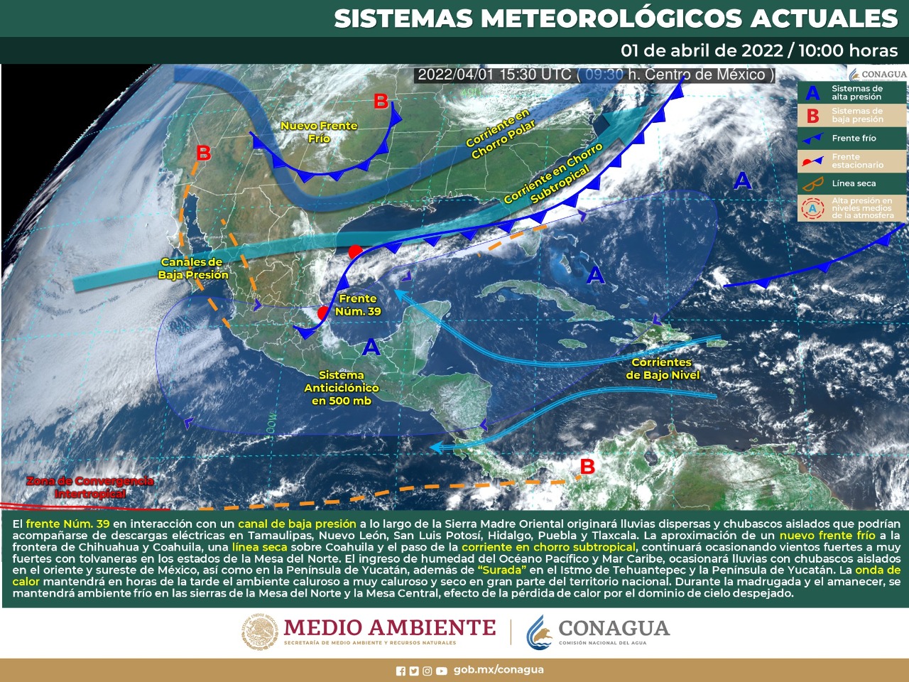 Para esta tarde de viernes primero de abril, el Frente Frío No. 39 dejará de afectar el territorio nacional lo que favorecerá un ambiente  de cálido a caluroso por la tarde, con temperaturas que pueden llegar hasta los 30 grados sobre la región centro, sur y noreste.