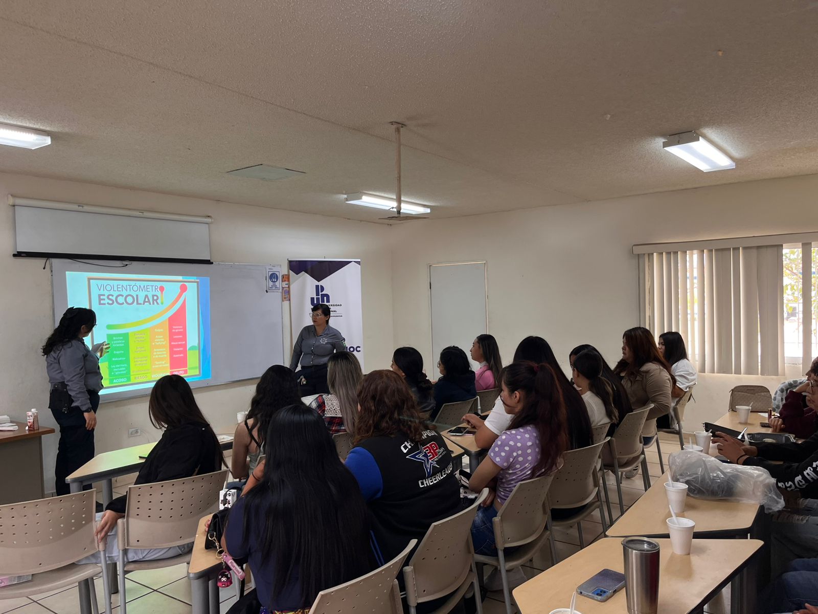 Cuauhtémoc, Chih.-Con el objetivo de fortalecer la convivencia sana y prevenir conductas de riesgo dentro de los entornos educativos, personal del área de Programas Preventivos (PASMI Prevención al Abuso Sexual y Maltrato Infantil) de la Dirección de Seguridad Pública Municipal acudió a la Universidad Pedagógica Nacional (UPN), para impartir el taller “Violencia Escolar”.
