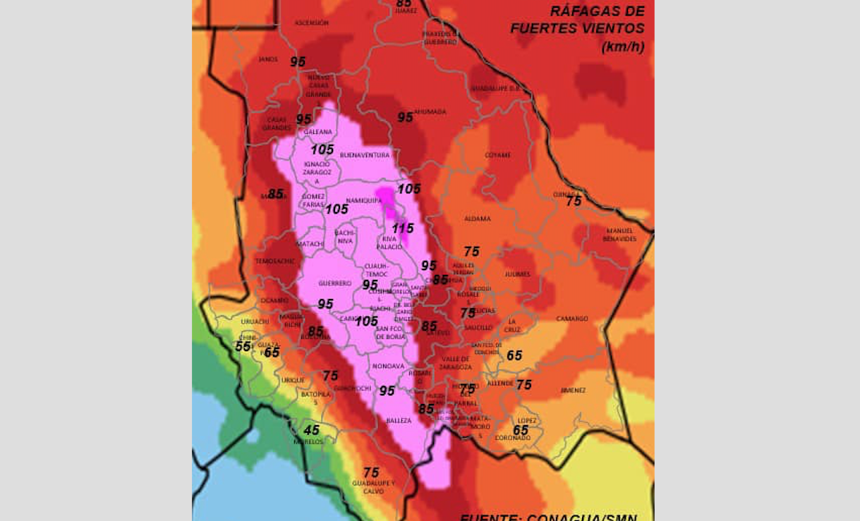 Asimismo pueden superar los 85 km/h en partes de las zonas en partes de las zonas norte, noroeste, oeste y sur, incluye Juárez, Madera, Temósachic, Maguarichi, Santa Bárbara, Chihuahua y Satevó.